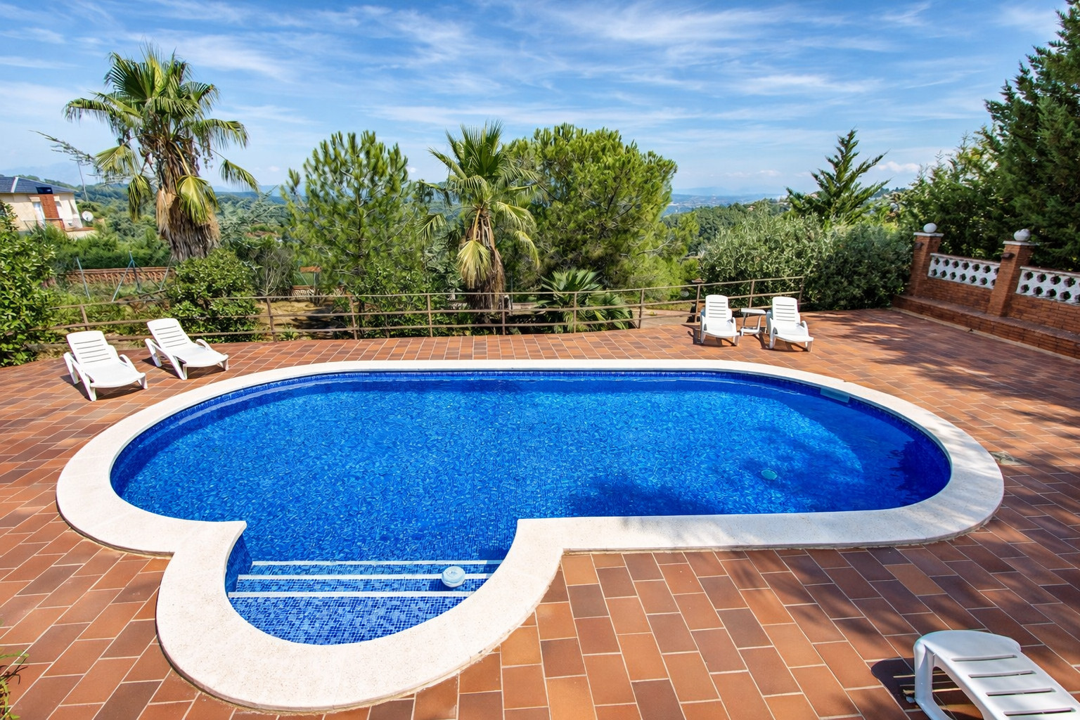 Se pueden pasar horas en el área de la piscina, un espacio bellamente embaldosado con impresionantes vistas de la campiña circundante. La piscina en sí (4,5 m x 10 m) ofrece el refugio perfecto del cálido sol español, con muchas tumbonas a su alrededor para tomar el sol y relajarse. Oculta entre los árboles en un espacio de césped elevado hay una pintoresca área de picnic para una cena informal, mientras que en la terraza hay una elegante mesa de vidrio, ideal para una cena acompañada de impresionantes vistas.