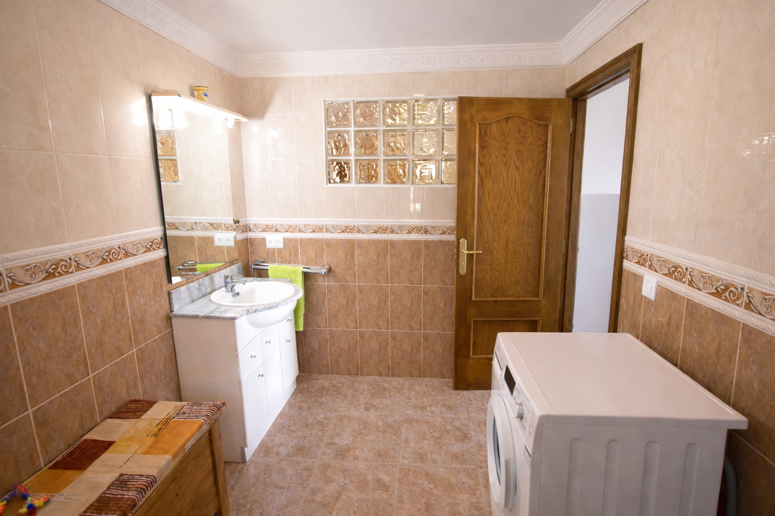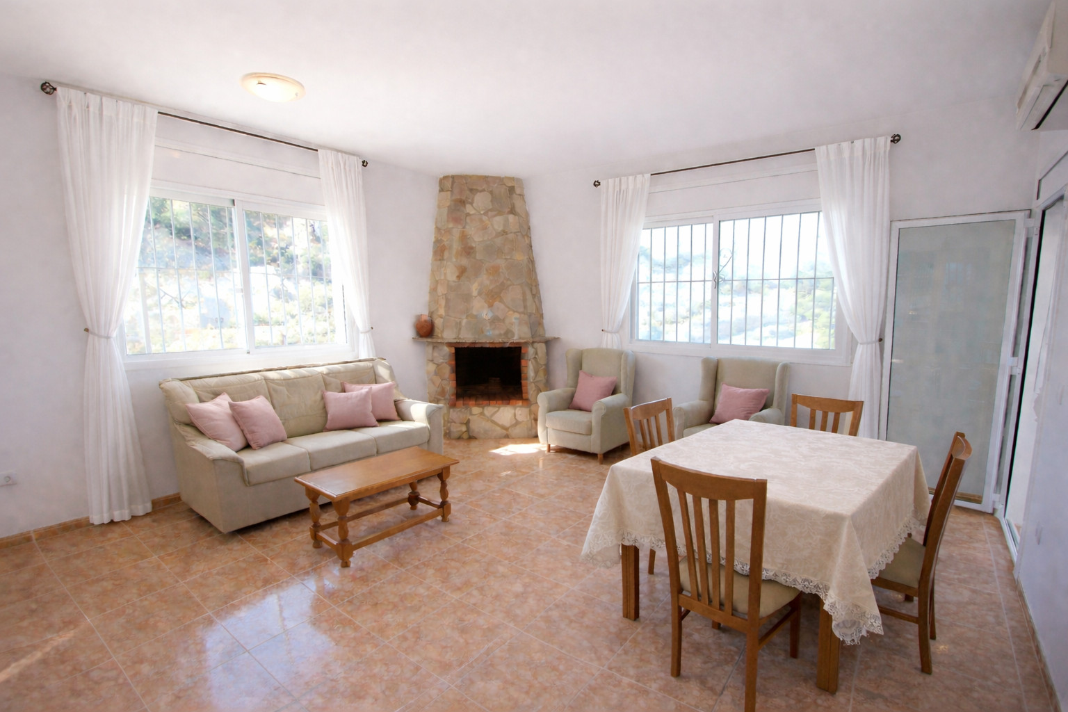 Al entrar, la sala de estar es espaciosa y luminosa, con grandes ventanales que inundan la habitación con el sol español. El punto focal de la habitación es la gran chimenea de ladrillo en la esquina que ayuda a hacer de la villa un hogar lejos del hogar. Además de un cómodo sofá y una unidad de TV, también hay una pequeña mesa de comedor con cuatro sillas, perfecta para desayunos y comidas ligeras. La cocina totalmente equipada también se encuentra en la planta principal y contiene todo lo que pueda necesitar para una estancia confortable, incluida una máquina de café.