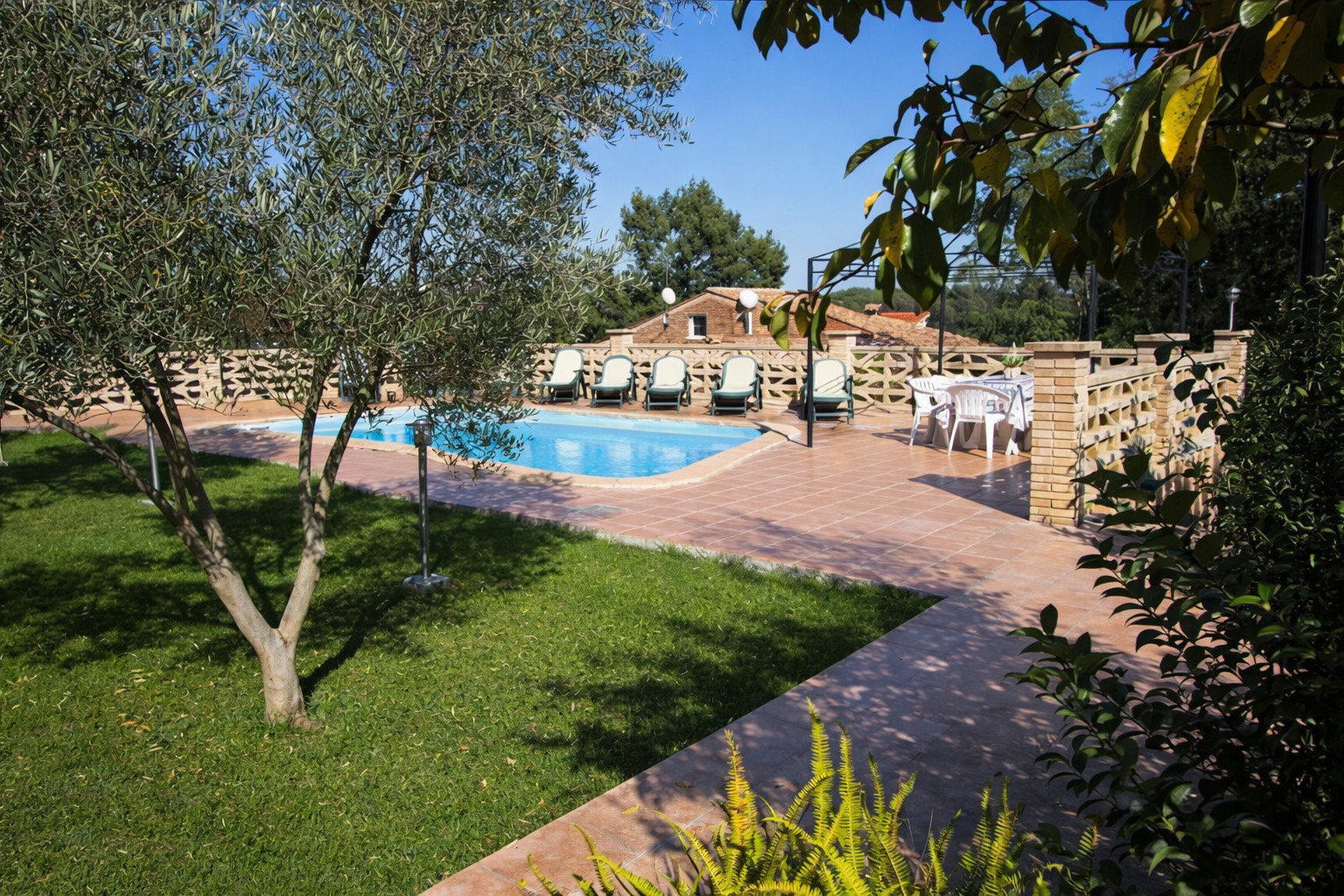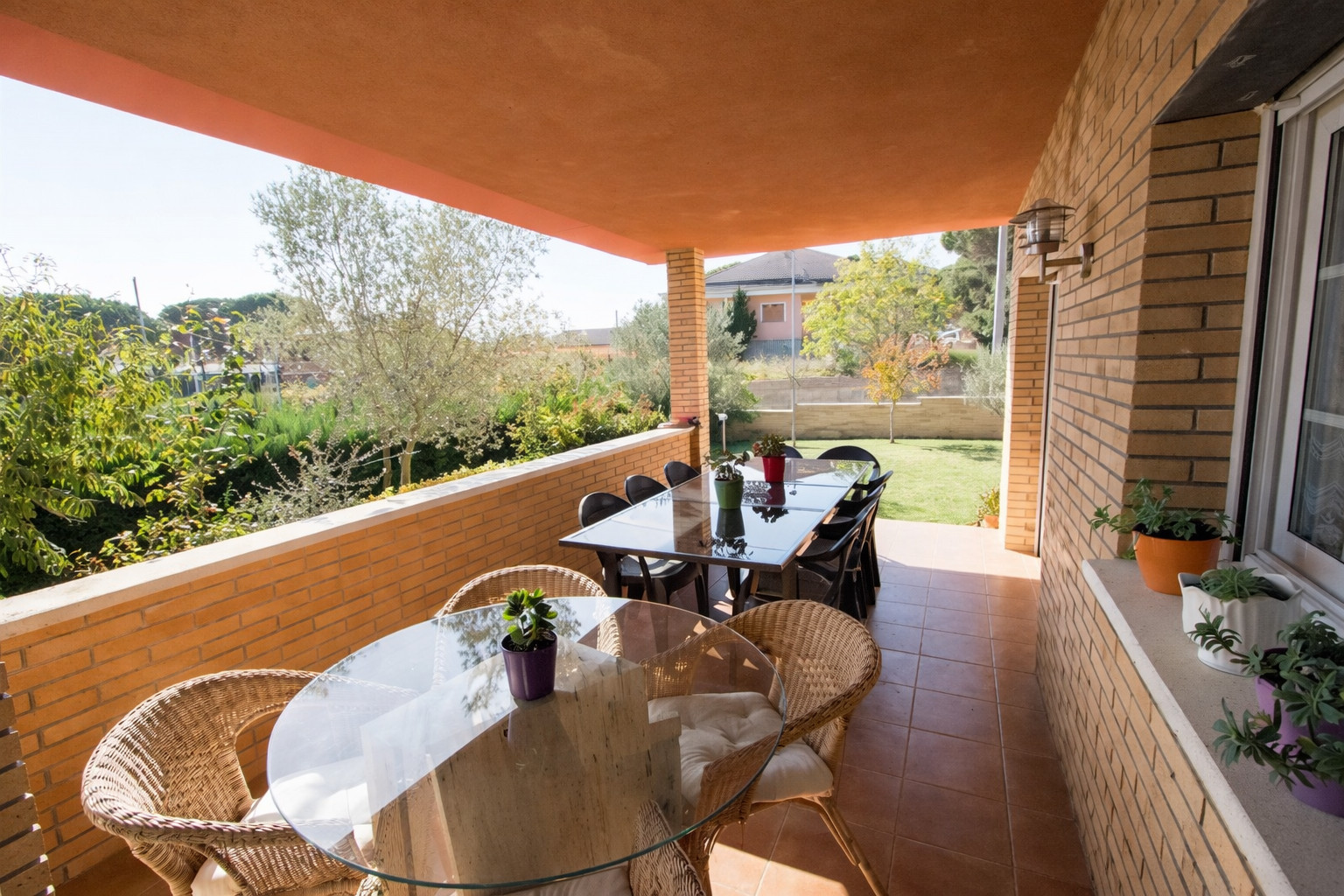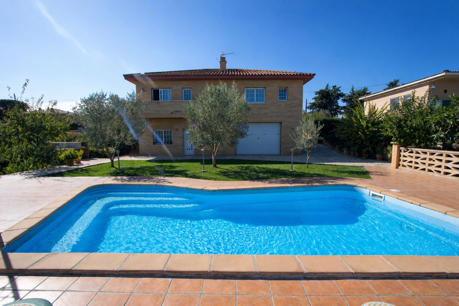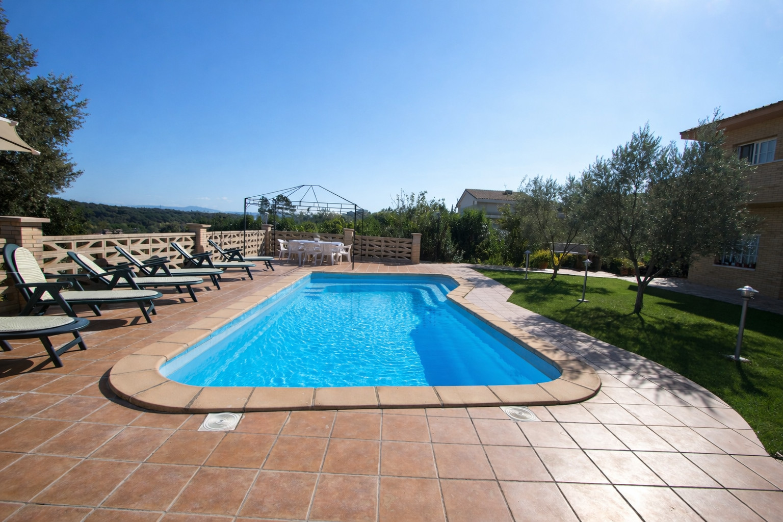 En la parte exterior, el amplio jardín equipado con tumbonas, comedor de verano, muebles de jardín y barbacoa, hacen que conjuntamente con la piscina con ascenso progresivo, pasemos unas veladas inolvidables cerca de la Costa Brava.