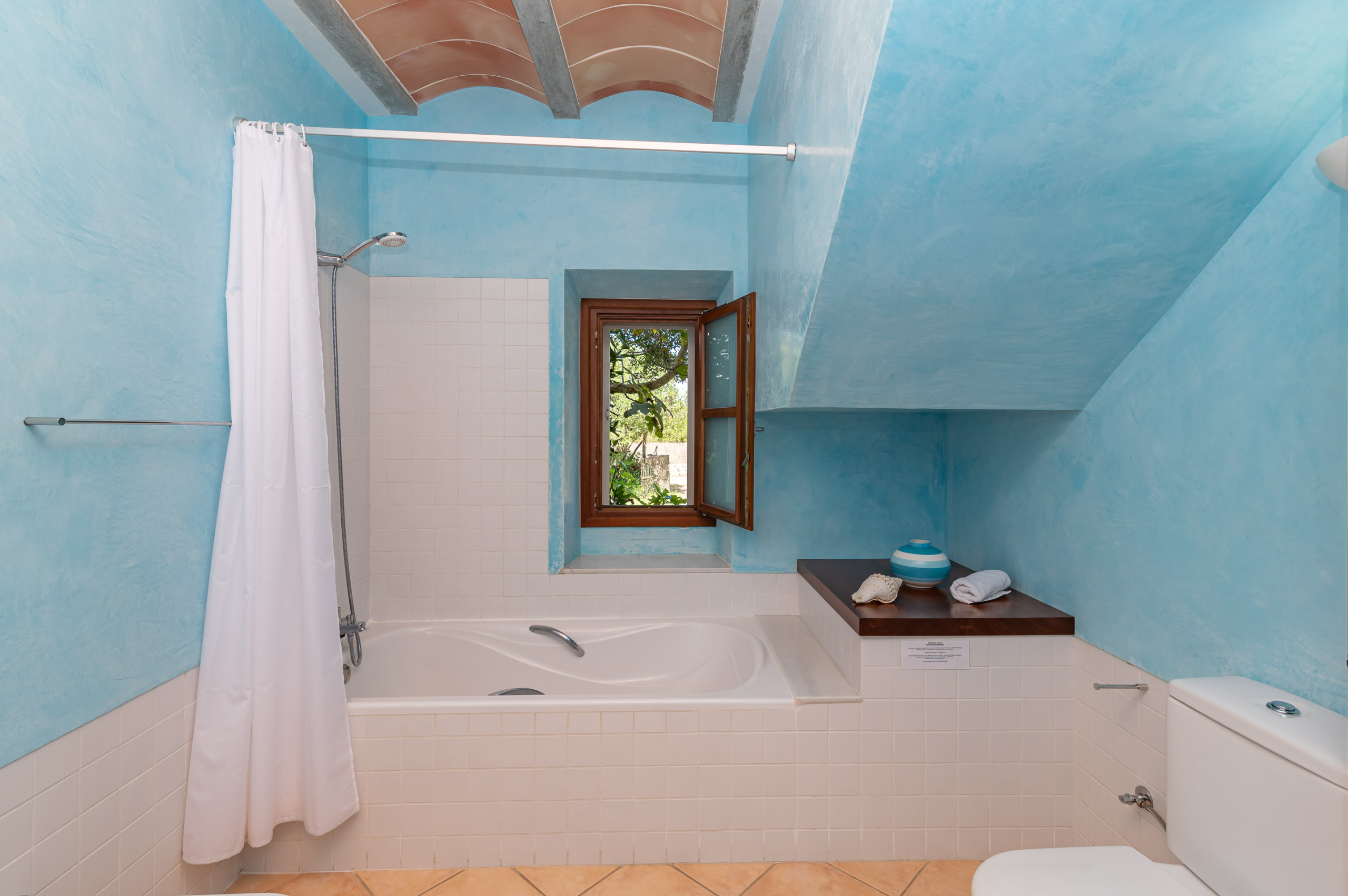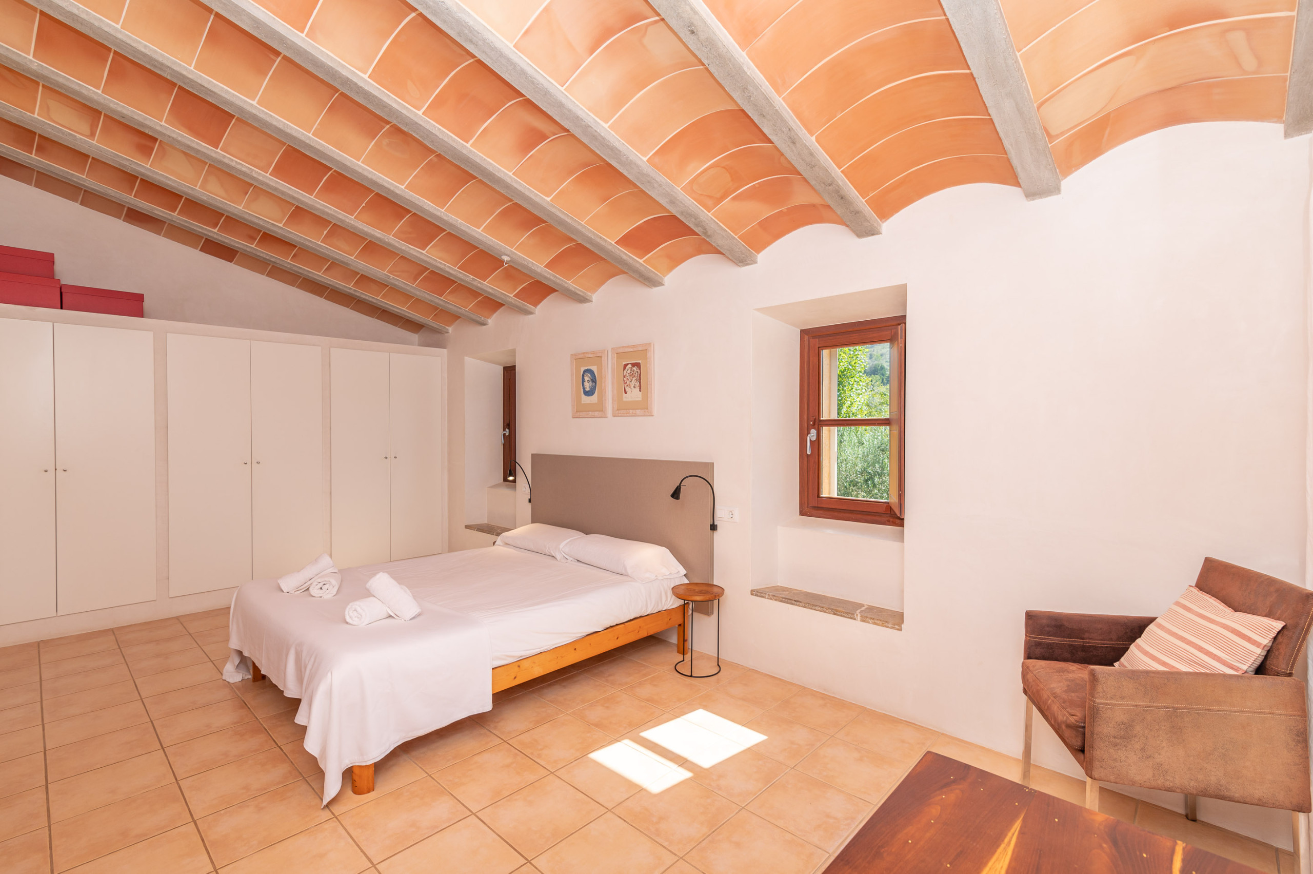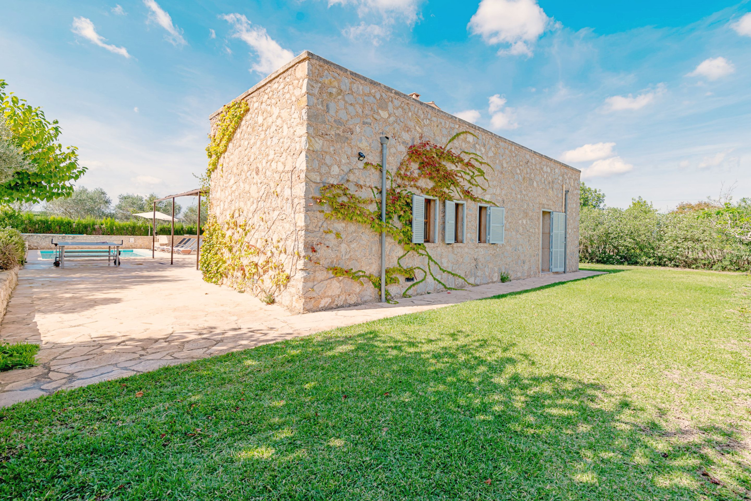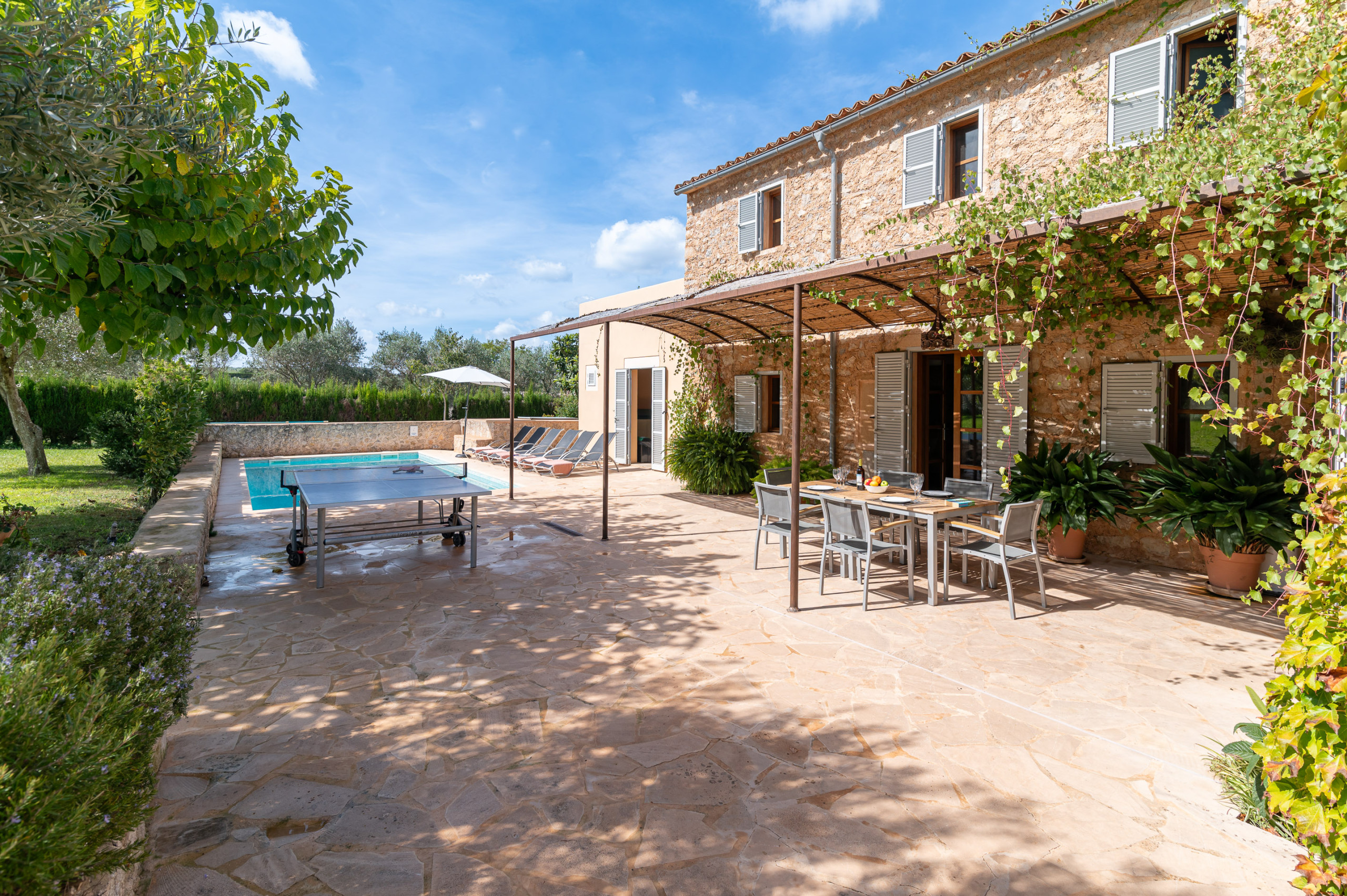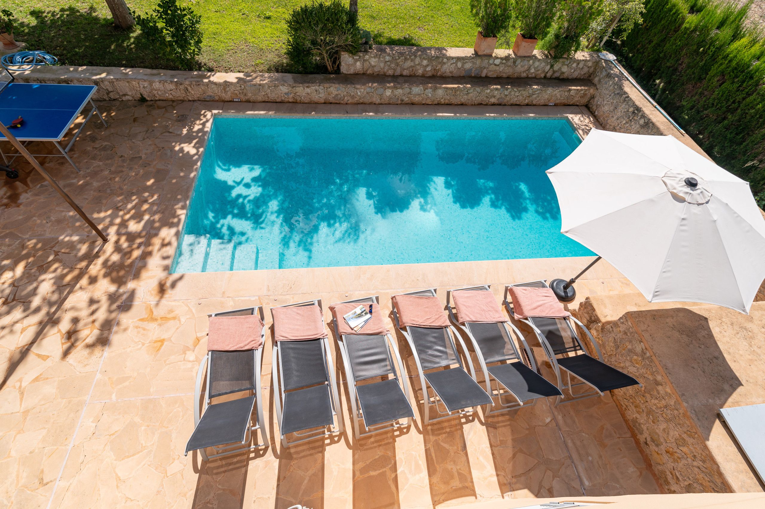 Les espaces extérieurs de la Villa Comella sont tout aussi uniques. En plus des vastes forêts environnantes, la villa dispose de 3 000 m² d’espaces solarium avec pelouse, arbustes et une grande piscine privée de 4,5 x 9,5 m (avec douche extérieure à côté de la piscine). Un véritable oasis de tranquillité, où vous pourrez passer des journées inoubliables sous le soleil majorquin, en profitant d’une intimité totale, d’un isolement complet et du doux chant des oiseaux. Pour les amateurs de repas en plein air, il y a de grandes terrasses avec table à manger et barbecue Weber, ainsi que des canapés en rotin. Vous pourrez également profiter d’une table de ping-pong.