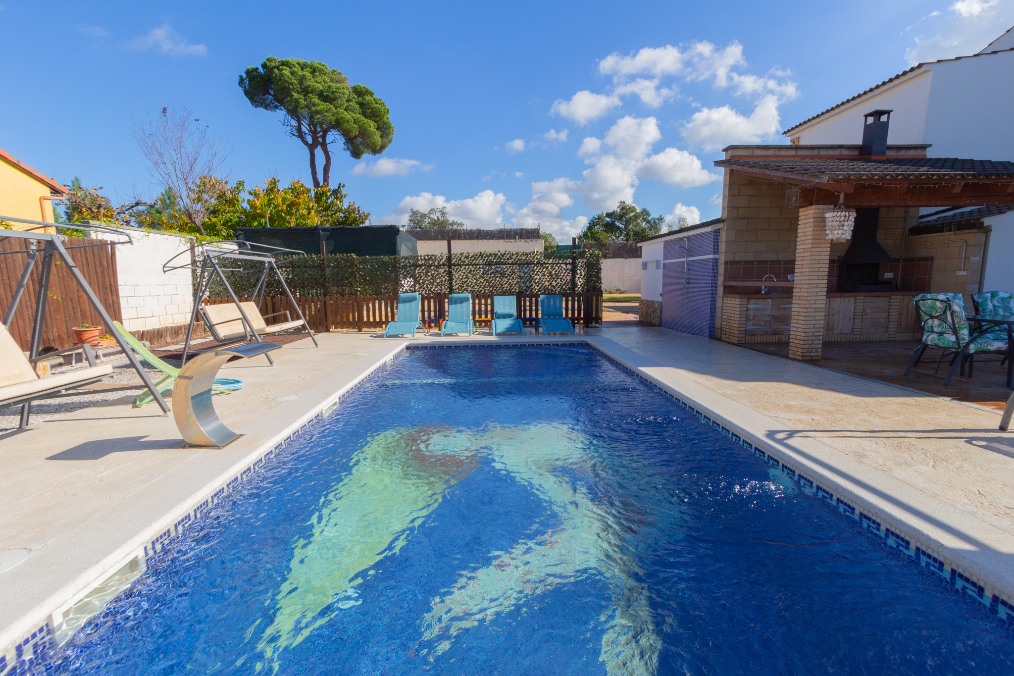 Dehors, il y a un grand jardin privé avec une maison d'enfants pour jouer, une zone couverte pour déjeuner, barbecue à charbon, des chaises longues, des parasols et une magnifique piscine privée de 4m de large par 7m de long avec une profondeur maximale de 1,50m!