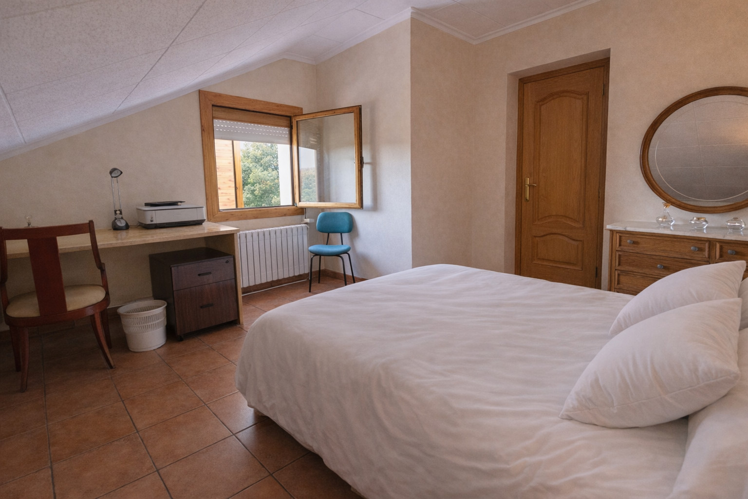 Inside this villa, there is a sunny dining room and kitchen, both with access to the terrace. Enjoy your favorite movies with a movie projector and its screen. The kitchen is equipped with all the necessities and utensils that you could find in your home. There is also a WC on the ground floor and a full bathroom on the first floor. The four rooms are distributed as follows: Two double beds (4 guests) One double bed (2 guests) One double bed (2 guests) One single bed (1 guest). Sizes of the beds are 100x200 cm for single bed and 130x200 cm for double bed.